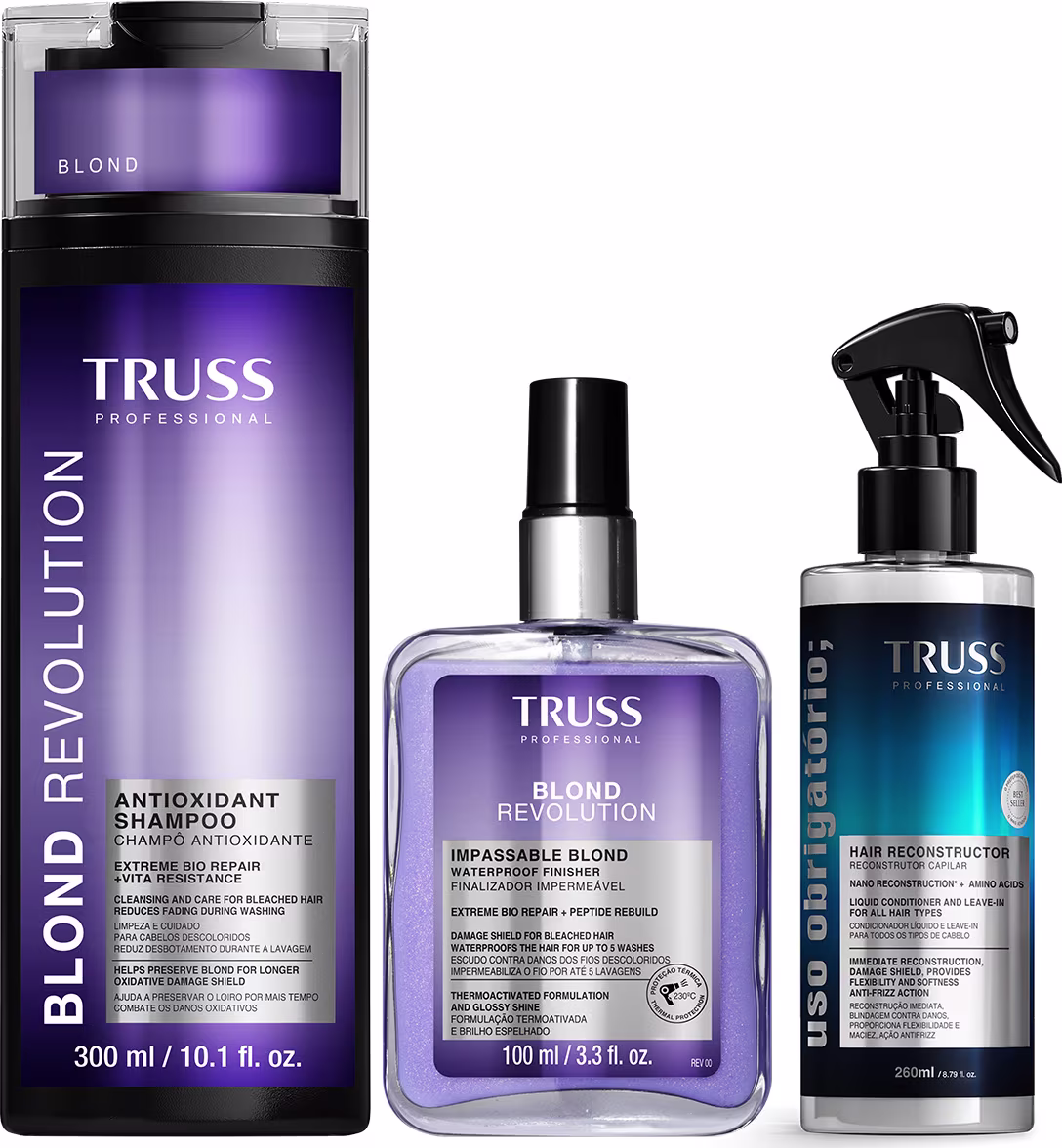 Este combo exclusivo da TRUSS oferece um tratamento completo para cabelos loiros, descoloridos ou grisalhos que necessitam de reconstrução e proteção. Com três itens complementares, ele atua desde a lavagem até a finalização, garantindo fios com a tonalidade desejada, saúde e resistência, além do cuidado icônico de Uso Obrigatório;.