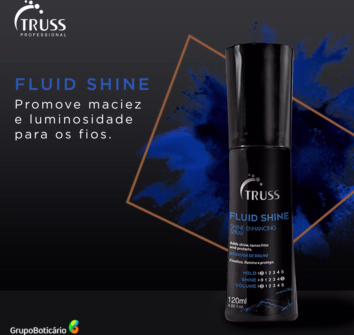 TRUSS FLUID SHINE é um spray de brilho de cabelo ideal para ser usado em fios opacos com frizz, pois promove brilho e ação antifrizz, deixando seus cabelos luminosos.
